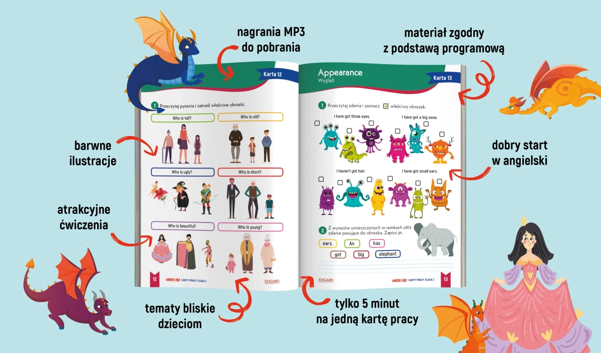 Drugoklasiści mogą uczyć się angielskiego, nie tylko w szkole, ale też w domu. A ty możesz zadbać, by nauka przebiegała w sposób przyjemny, nie obciążający planu dnia, a jednocześnie skuteczny. Wystarczy tylko 5 minut i jedna karta pracy dziennie, by zaciekawić dziecko angielskim, zbudować językową pewność siebie i wzmocnić jego poczucie własnej wartości w szkole i w życiu na lata.