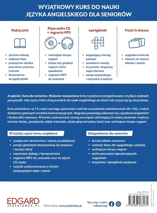 Angielski. Kurs dla seniorów. Wydanie rozszerzone (poziom A1–A2) to kompletny zestaw edukacyjny stworzony specjalnie dla osób po 60. roku życia, które chcą rozpocząć naukę od podstaw lub uporządkować wcześniej zdobytą wiedzę. Materiały zostały przygotowane z myślą o komforcie seniorów – większe litery, wyraźny podział treści i przyjazny język to tylko początek.
