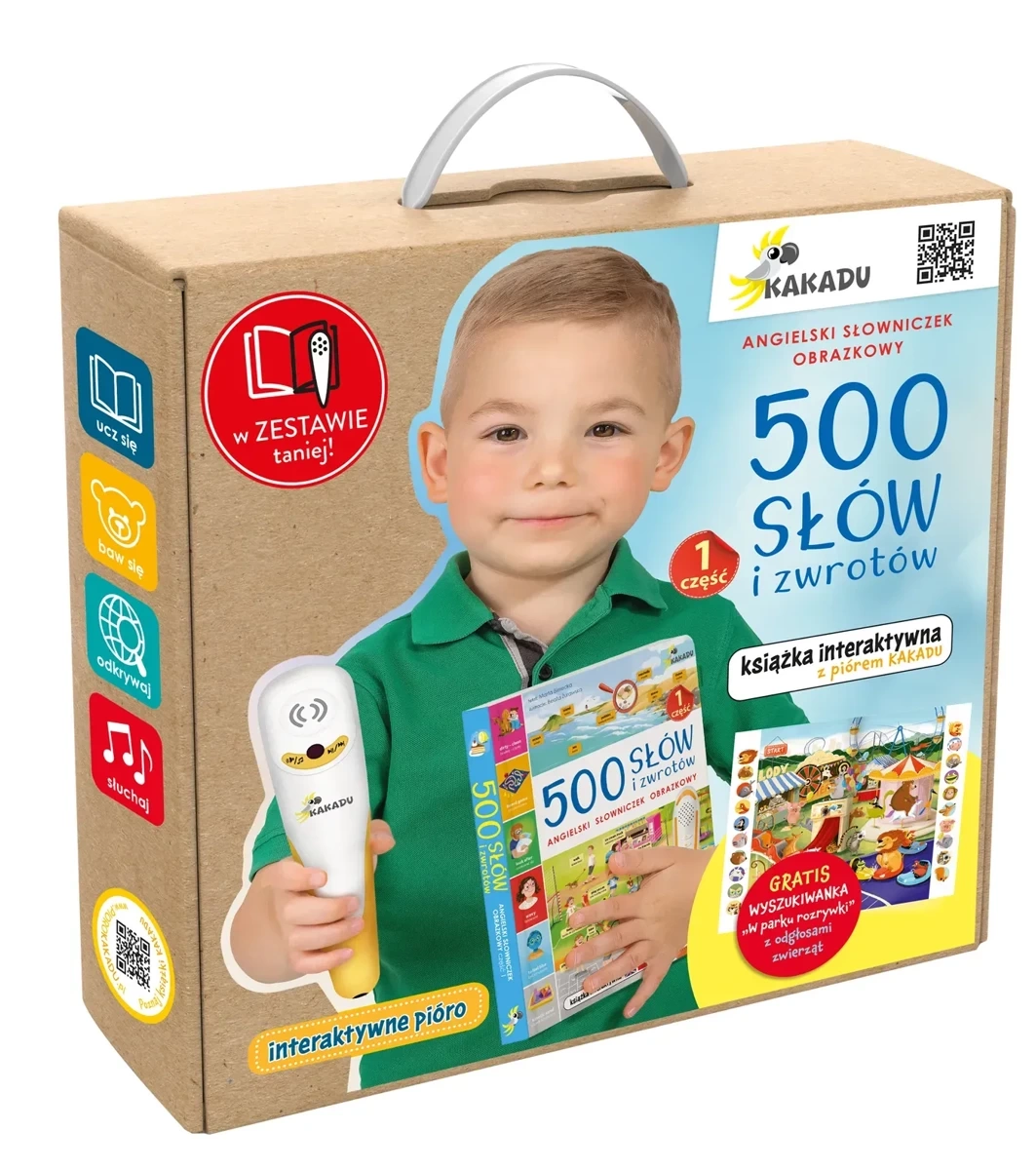 Zestaw zawiera: książkę 500 słów i zwrotów. Angielski słowniczek obrazkowy cz. 1 , pióro Kakadu w trwałym etui i planszę z wyszukiwanką W parku rozrywki , dzięki której dzieci sprawdzą swoją spostrzegawczość, poznają nazwy zwierząt i usłyszą odgłosy, jakie one wydają. Całość została zamknięta w pudełku z rączką. 500 słów i zwrotów. Angielski słowniczek obrazkowy cz. 1 to interaktywna książka z piórem Kakadu, które uruchamia zakodowane na stronach teksty i dźwięki. Publikacja jest częścią innowacyjnego systemu nauki i zabawy w jednym. Książka jest następnym krokiem w nauce języka angielskiego po Angielskim słowniczku obrazkowym Kakadu. Młody czytelnik nie tylko pozna nowe słowa, ale także utrwali ich wymowę dzięki świetnej oprawie lektorskiej. Pełne humoru ilustracje Beaty Żurawskiej będą nieocenionym wsparciem podczas nauki. W tym interaktywnym słowniczku znajdują się także zabawne łamańce językowe, rymowanki i piosenki. Umieszczone przy każdym temacie pytania i polecenia nie tylko rozwiną umiejętności rozumienia słuchanego tekstu, ale także dostarczą dzieciom zabawy oraz informacji o postępach w nauce języka angielskiego. Pozostałe tytuły książek Kakadu: Widzę, słyszę, poznaję. Zwierzęta domowe Widzę, słyszę, poznaję. Zwierzęta świata Widzę, słyszę, poznaję. Dźwięki wokół mnie Widzę, słyszę, poznaję. Dźwięki na spacerze Angielski słowniczek obrazkowy Pory roku Pierwsze litery Kim zostanę, gdy dorosnę? Boże Narodzenie z kolędami Wszystko gra! Poznajemy instrumenty muzycznePodmiot odpowiedzialny za ten produkt na terenie UE