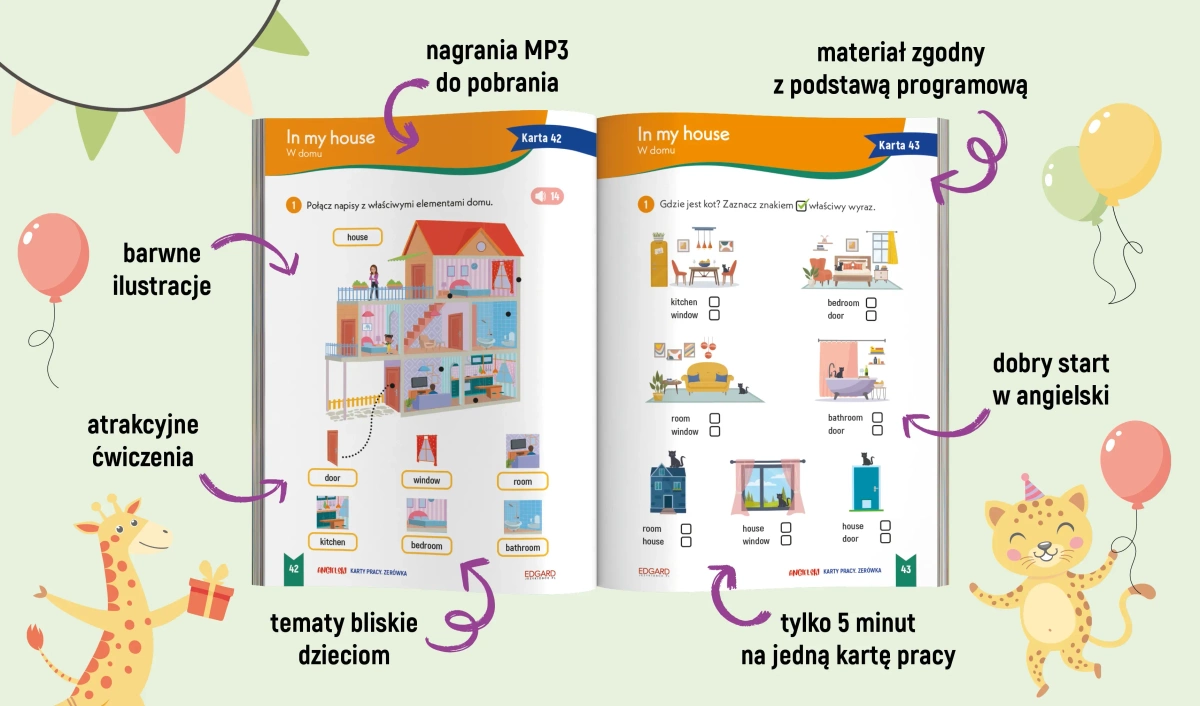 Zadania są ciekawe i różnorodne, utrwalają treści poznawane na zajęciach w zerówce, a nagrania wspierają naukę wymowy już od początku nauki. Dzięki kolorowej i przyjaznej szacie graficznej angielski sam wchodzi do głowy.