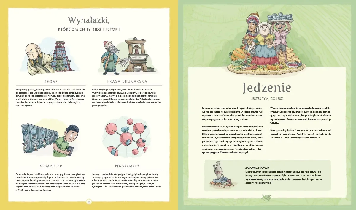 Przygotuj się, by wyruszyć na wspaniałą wyprawę odkrywczą. Pewnie przydałaby ci się mapa… Mapy w Atlasie wynalazków są bardzo szczególne. To wspaniałe sceny pełne niesamowitych wynalazków i spektakularnych odkryć. Przemierzaj tysiąclecia i podziwiaj twórcze talenty ludzkości, a dowiesz się, w jaki sposób wynaleźliśmy pismo, malarstwo, samochody i czekoladę – oraz mnóstwo innych rzeczy. Napotkasz roboty i dinozaury. Obejrzysz miniaturowe sondy kosmiczne, prastary ser i wrak Titanica. To będzie nadzwyczajna podróż. Jesteś gotów do akcji? Thiago de Moraes jako dziecko wciąż był strofowany za to, że zamiast się skupiać, bazgrolił. Nadal jest ganiony, tylko już nie za stawianie zygzaków. Kiedy nie czyta i nie rysuje starożytnych bogów, Thiago tworzy książki dla dzieci. Jest laureatem wielu nagród za ilustracje. Mieszka w południowym Londynie z rodziną. Powyższy opis pochodzi od wydawcy