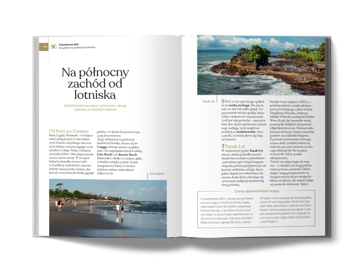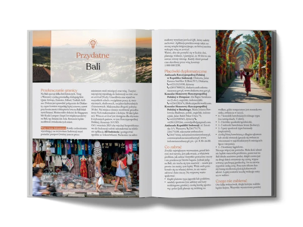 PRZYDATNE: Rozdział ważny przed wyjazdem, ale i w trakcie podróży. Najważniejsze informacje praktyczne (np. dojazd z lotniska do centrum, czas lokalny, pieniądze, dostęp do internetu, numery alarmowe i kierunkowe, placówki dyplomatyczne). Najistotniejsze z tych informacji znajdziecie także na okładce rozkładanej mapy.