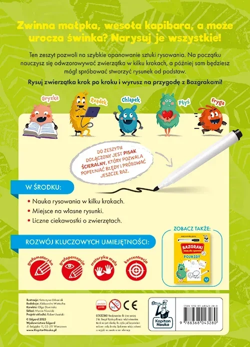 Jeśli któryś zwierzak nie będzie od razu wyglądał idealnie – spokojnie! Dziecko może dopracowywać swoje rysunki. Do zeszytu został dołączony pisak ścieralny , który pozwala na popełnianie błędów i umożliwia kolejne próby.
