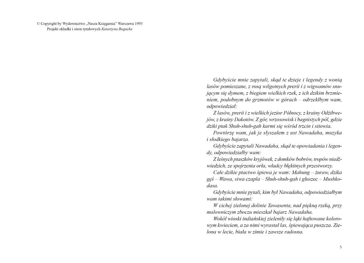 Zbiór klasycznych baśni i legend z Ameryki Północnej. Przedstawia świat rdzennych mieszkańców tych ziem, ich życie, wierzenia oraz obyczaje. Książka zalecana jako lektura dla szkoły podstawowej.