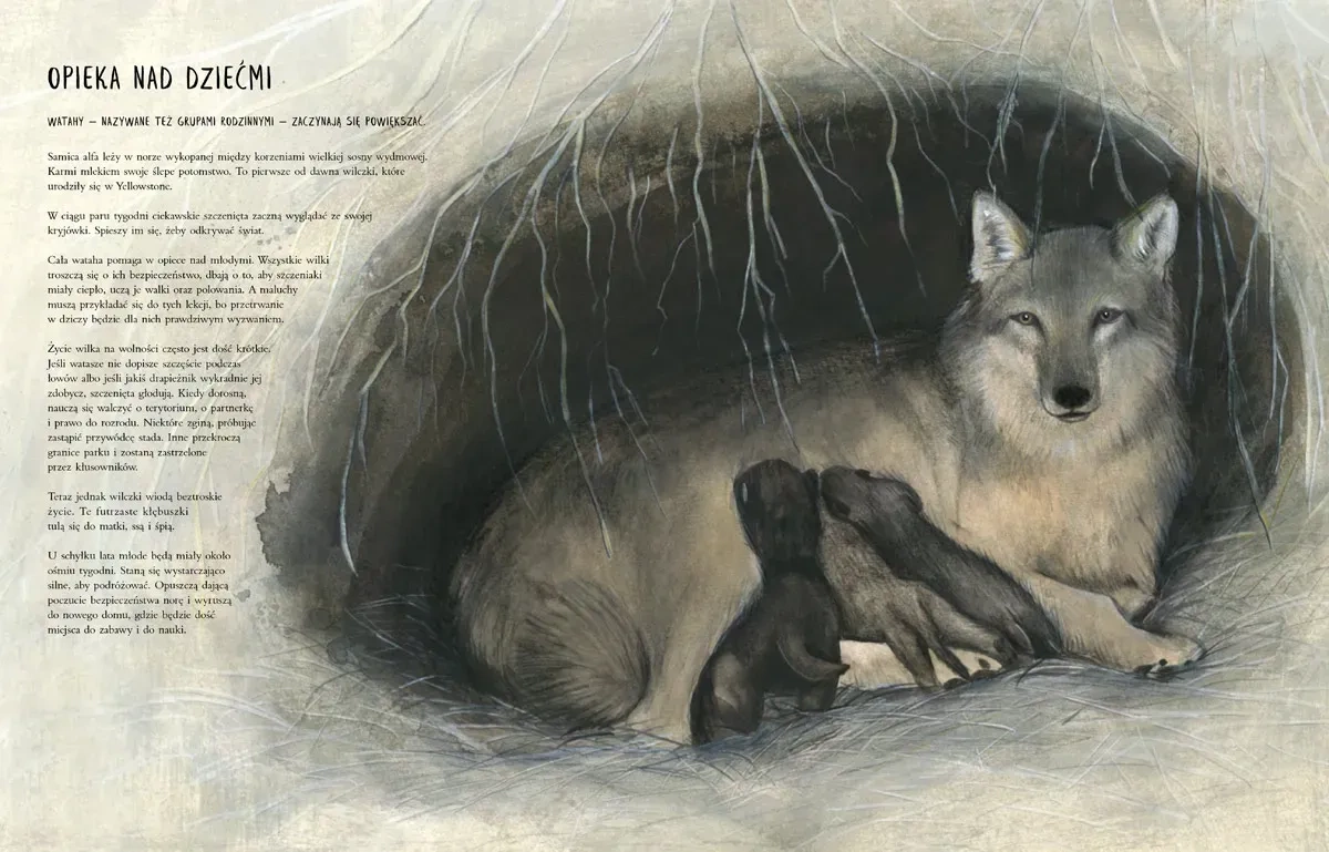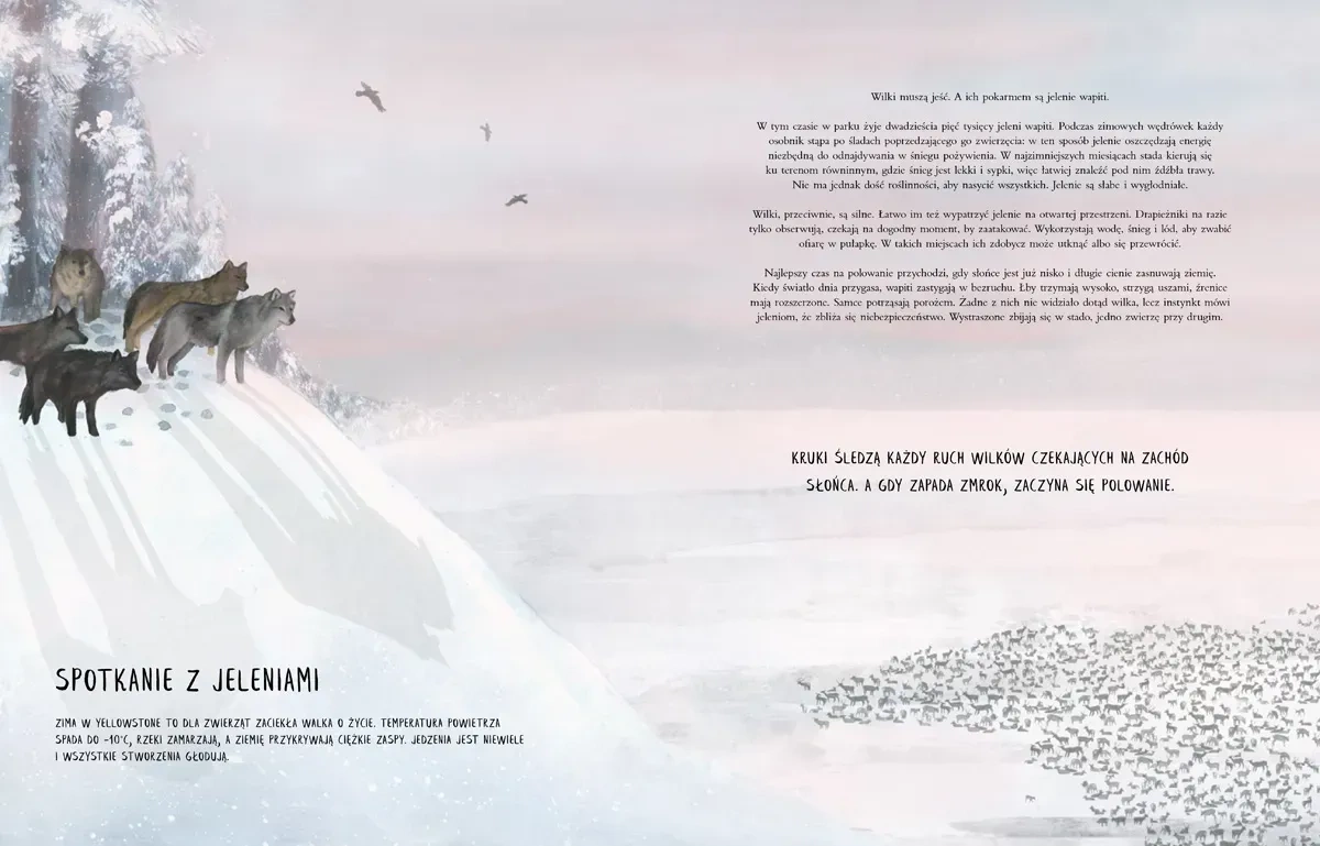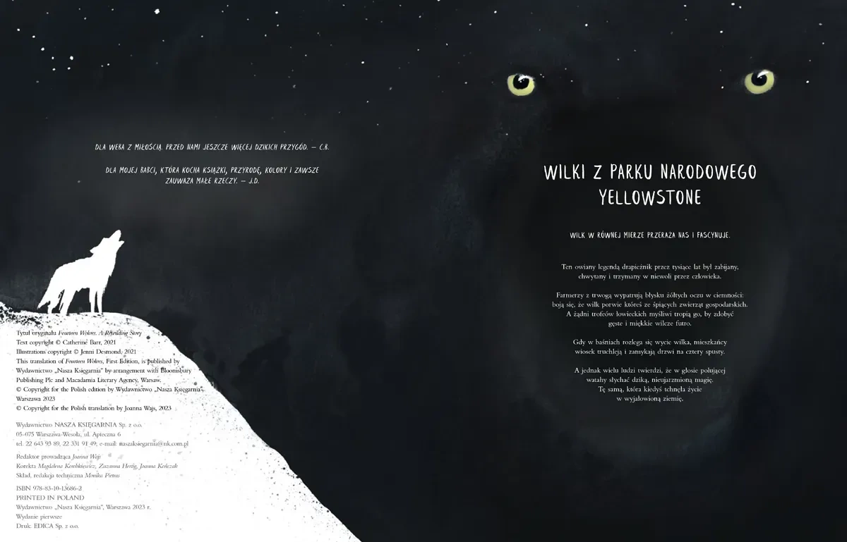 Kiedy wybite przez kłusowników, myśliwych i farmerów wilki znikły z parku narodowego, populacja jeleni wapiti nadmiernie się rozrosła i zagroziła wielu gatunkom roślin. Część ptaków odleciała w poszukiwaniu nowych siedlisk. Nawet niedźwiedzie przymierały głodem. Na szczęście dzięki determinacji i uporowi ekologów stworzono system reintrodukcji gatunku i zimą 1995 roku do Yellowstone trafiło kilkanaście kanadyjskich wilków. Catherine Barr, która relacjonuje ich losy, w fascynujący sposób opowiada o współzależnościach w świecie przyrody. Udowadnia, że drapieżniki są niezbędne w ekosystemie, i pokazuje, jak człowiek (z niewiedzy, egoizmu lub ze strachu) narusza kruchą równowagę planety.