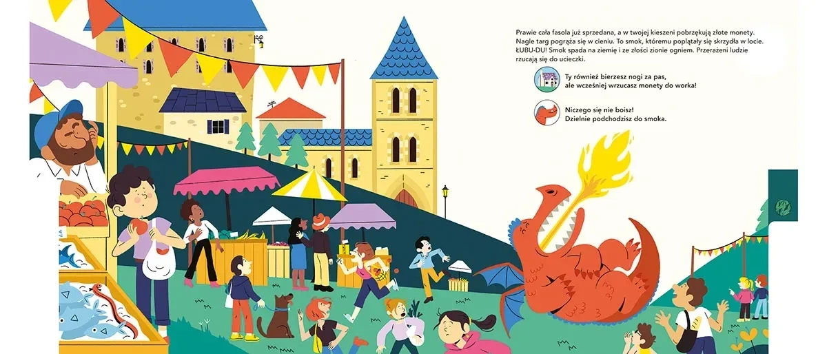 W tej książce dziecko może robić to, co uwielbia najbardziej: o wszystkim DECYDOWAĆ. Mały czytelnik wciela się w syna biednej wdowy – poczciwego Jasia, którego mama posyła na targ, aby sprzedał jedyną krowę. Po drodze chłopak spotyka staruszka, który proponuje mu wymianę: zwierzę za magiczne fasolki. Tu Jaś-czytelnik musi wybrać po raz pierwszy: zgodzić się na wymianę czy nie? Podobne dylematy czekają na każdej stronie – czytelnik musi zdecydować, co zrobić z zaczarowanymi nasionami, czy wspiąć się po magicznej roślinie, czy pomóc smokowi i jak rozprawić się z ogrem. Za każdym wybiera jedną z dwóch ikonek, która za pomocą indeksu odsyła do różnych miejsc w książce.