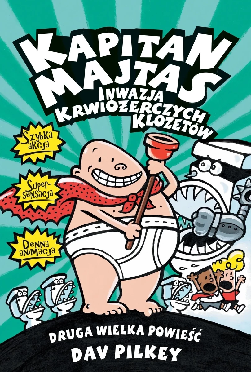 W szkolnym turnieju wynalazców mogą wziąć udział wszyscy uczniowie z wyjątkiem George’a i Harolda. KOTEK 2000 czyli kopiarka oscylografometrycznych trójwymiarowych efektów kryptowirtualnych wpada niestety w powołane ręce!!! Z bocznej klapy KOTKA 2000 wyskakują lśniące klozety naturalnej wielkości! Mają wyłupiaste oczy i ostre kły. Ich ulubione powiedzonko to: Mniam, mniam, zjeść ich! Tylko szybszy od strzelającej gumki od majtek i silniejszy od bokserek przewspaniały Kapitan Majtas może uratować świat. I to właśnie robi. Pokonuje z łatwością nawet TURBOKLOZET 2000!