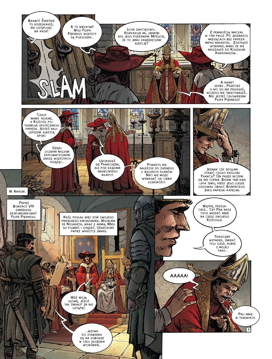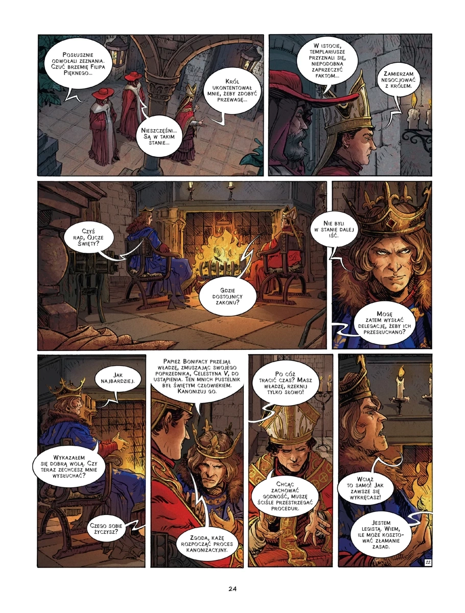 Kolejny tom kolekcji przybliżającej historię zachodniego świata przez pryzmat papiestwa. Tym razem opowieść dotyczy Klemensa V, którego pontyfikat naznaczony był ciągłą walką z próbującym narzucić papiestwu swoją wolę królem Francji Filipem Pięknym. Jednym z punktów zapalnych było dążenie monarchy do zlikwidowania zakonu templariuszy. Ze względu na trwające w Rzymie zamieszki Klemens V zdecydował się przenieść siedzibę papiestwa do Awinionu, co stało się początkiem trwającej 70 lat tzw. niewoli awiniońskiej papieży.