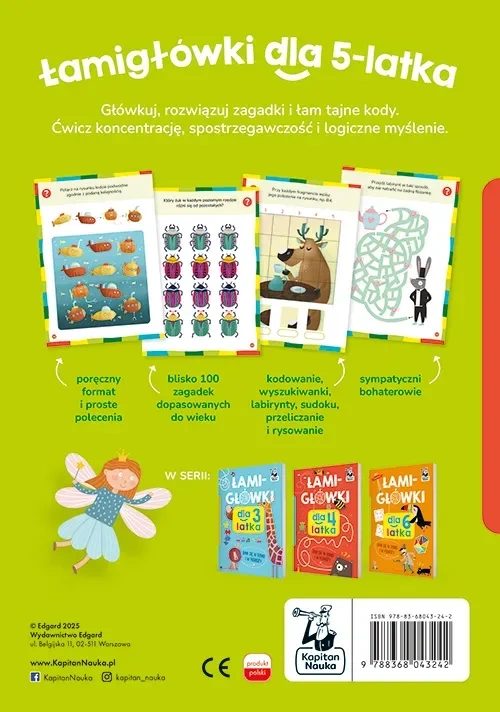 Łamigłówki dla 5-latka zapewnią dzieciom długie godziny dobrej zabawy. Zagadki pomogą doskonalić logiczne myślenie oraz wskazywanie różnic i podobieństw, a także umożliwią wykonywanie pierwszych obliczeń matematycznych. Proste polecenia i zabawy grafomotoryczne przygotują 5-latki do nauki czytania ze zrozumieniem oraz pisania. Zadaniom towarzyszą sympatyczni bohaterowie, którzy wprowadzają dzieci w świat kodów, labiryntów i tajemniczych szyfrów.