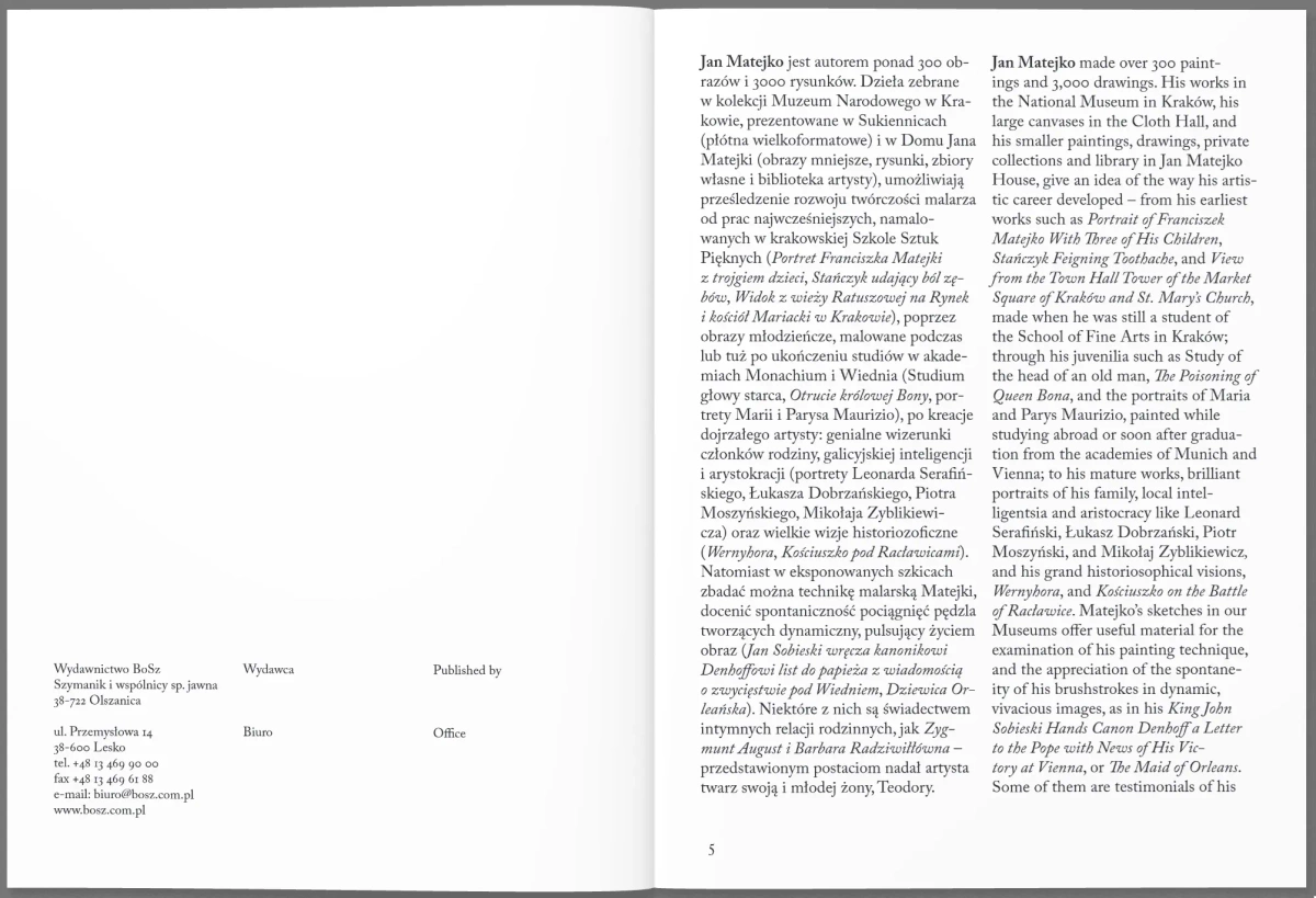 Dzieła zebrane w albumie umożliwiają prześledzenie rozwoju twórczości malarza od prac najwcześniejszych, namalowanych w krakowskiej Szkole Sztuk Pięknych (Portret Franciszka Matejki z trojgiem dzieci, Stańczyk udający ból zębów, Widok z wieży Ratuszowej na Rynek i kościół Mariacki w Krakowie), poprzez obrazy młodzieńcze, malowane podczas lub tuż po ukończeniu studiów w akademiach Monachium i Wiednia (studium głowy starca, Otrucie królowej Bony, portrety Marii i Parysa Maurizio), po kreacje dojrzałego artysty: genialne wizerunki członków rodziny, galicyjskiej inteligencji i arystokracji (portrety Leonarda Serafińskiego, Łukasza Dobrzańskiego, Piotra Moszyńskiego, Mikołaja Zyblikiewicza) oraz wielkie wizje historiozoficzne (Hołd pruski, Wernyhora, Kościuszko pod Racławicami).