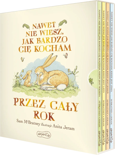 Niezwykła kolekcja czterech książek z bestsellerowej serii 'Nawet nie wiesz, jak bardzo cię kocham' w nowym, złoconym etui prezentowym! To przepiękne, wyjątkowe pudełko zawiera wydane wcześniej osobno książki: - Nawet nie wiesz, jak bardzo cię kocham, kiedy jest wiosna, - Nawet nie wiesz, jak bardzo cię kocham, kiedy jest lato, - Nawet nie wiesz, jak bardzo cię kocham, kiedy jest jesień, - Nawet nie wiesz, jak bardzo cię kocham, kiedy jest zima. Opowieści autorstwa Sama McBratneya i Anity Jeram o Małym Brązowym Zajączku i Dużym Brązowym Zającu, ze zmieniającymi się porami roku w tle, są mądre, zabawne i porywające. To najlepszy prezent urodzinowy lub świąteczny, który z pewnością zachwyci każde dziecko!