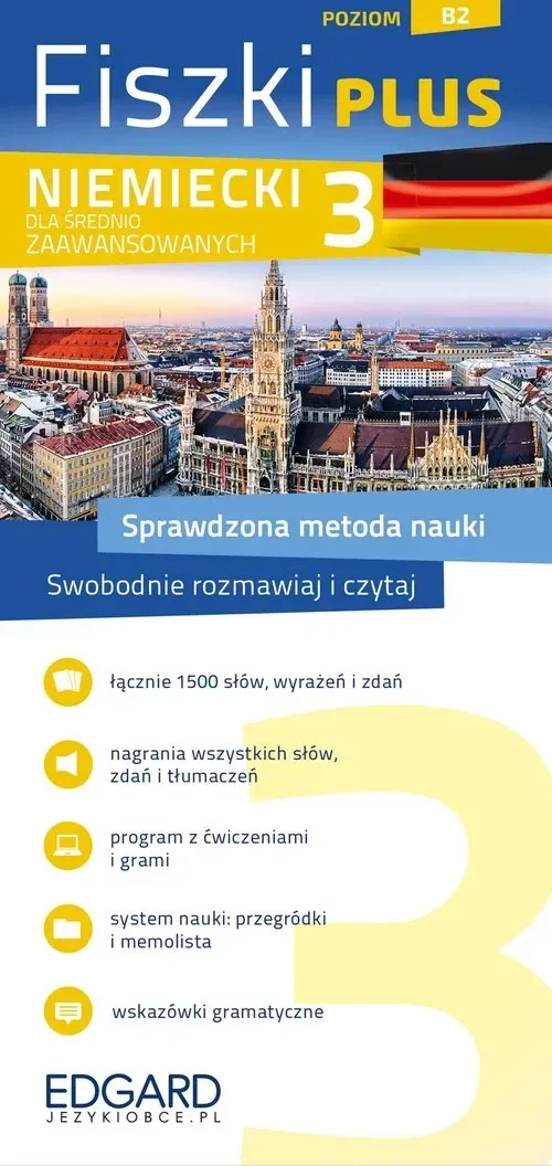 Niemiecki Fiszki PLUS dla średnio zaawansowanych 3 (B2) to pakiet będący częścią rozbudowanego systemu nauki, dzięki któremu szybko i skutecznie nauczysz się słownictwa na każdym poziomie zaawansowania. Każdy zestaw Fiszek PLUS to starannie przygotowany materiał, wysokiej jakości nagrania wymowy wraz z programem komputerowym, memolistą i grami językowymi.