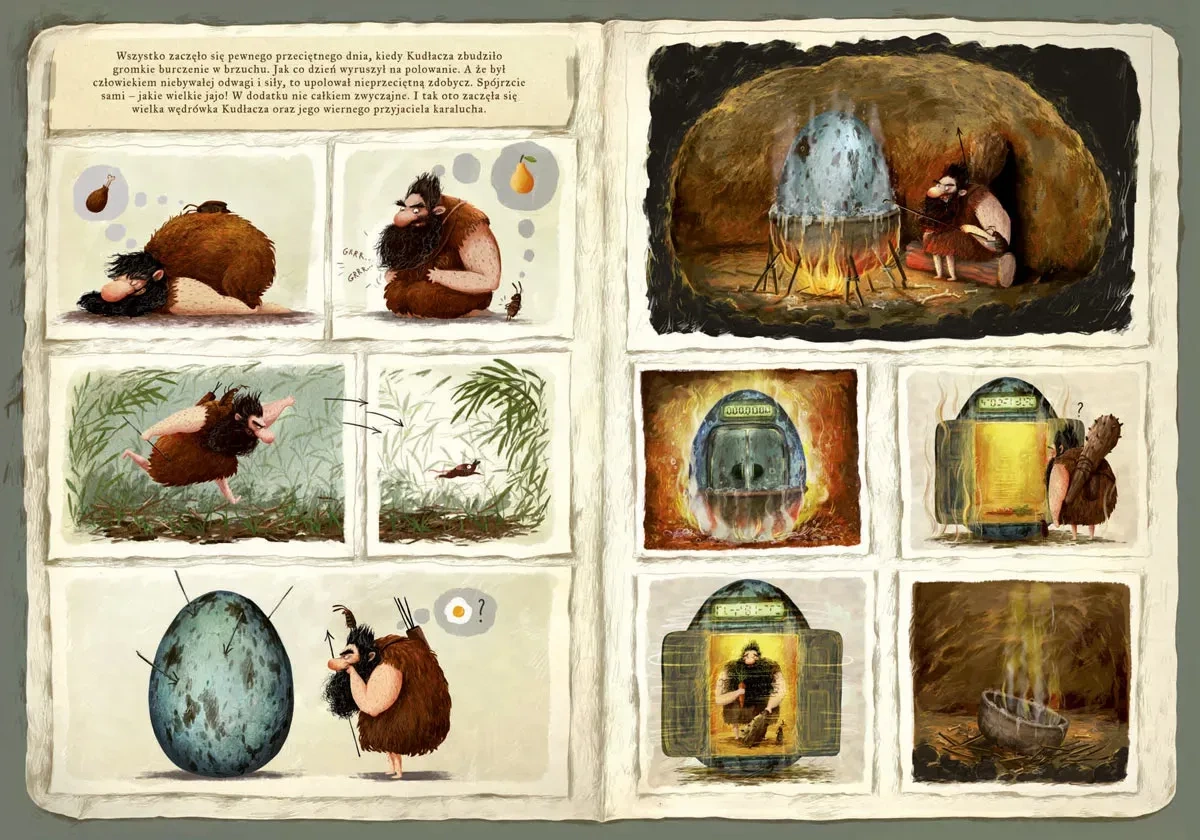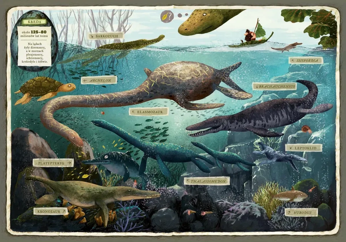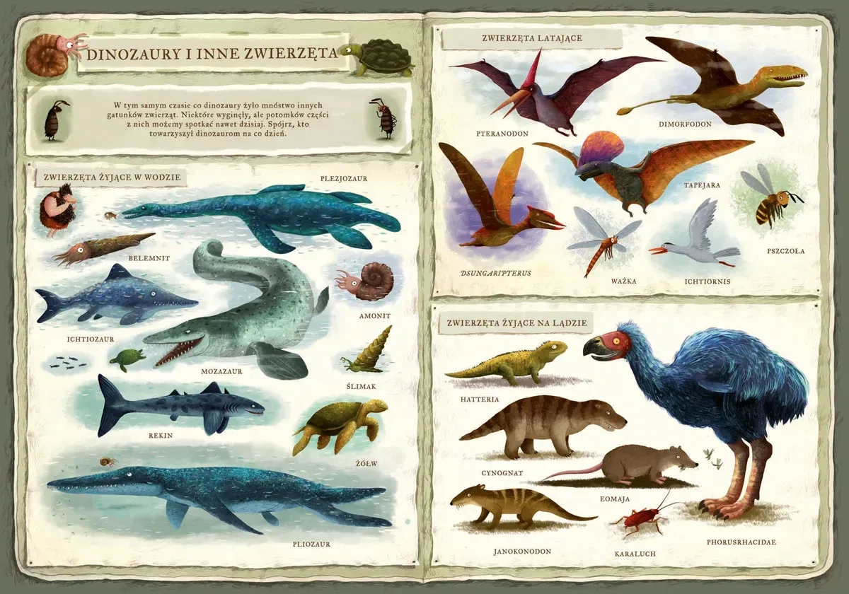 Kudłacz i karaluch wyruszają w podróż… w czasie. Trafią do krainy dinozaurów i poznają te niezwykłe zwierzęta: olbrzymiego Riochazaura, Trematozaura, który zgubił jajo, roślinożernego Diplodoka, żyjącego w wodzie Plejozaura, Tyranozaura Rexa kłócącego się z Ankylozaurem, latające Archaeopteryxy i wiele, wiele innych. Edukacja, humor, zadania interaktywne, a przede wszystkim piękne ilustracje Emilii Dziubak sprawiają, że nie sposób przejść obok tej książki obojętnie. To znakomity prezent dla dzieci w wieku od 2 do 6 lat.