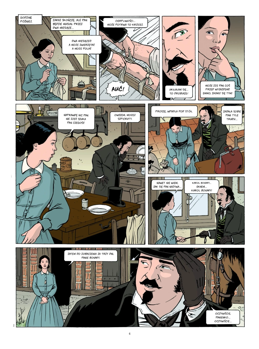 Komiksowa adaptacja powieści jednego z największych mistrzów literatury francuskiej XIX wieku – Gustaveʼa Flauberta. Francja, czasy panowania Ludwika Filipa. Córka rolnika, piękna Emma, wychodzi za mąż za starszego od siebie Karola Bovary’ego, nieśmiałego prowincjonalnego lekarza, wiodącego proste i skromne życie. Podczas balu u lokalnego dostojnika Emma odkrywa wspaniałości dobrego towarzystwa i stopniowo oddala się od zwyczajnej poczciwości męża. Chroni się w marzeniach i niczym kokietka pozwala się uwodzić, mnoży długi i kochanków, nie znajdując jednak szczęścia. Ostatecznie, zagubiona i zrujnowana, nieskutecznie szuka sposobu, aby uciec od wstydu zmarnowanego życia.