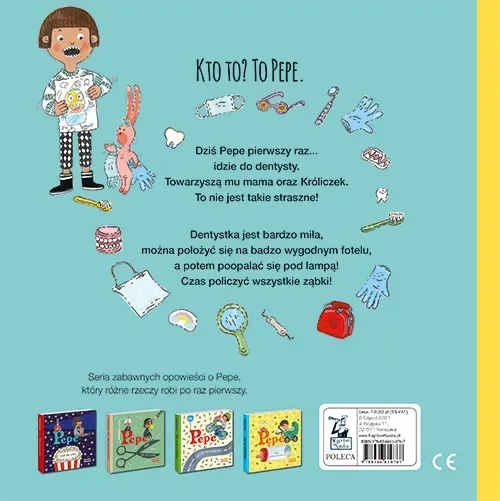 Książka obrazkowa z prostą historią i kolorowymi ilustracjami, które nie tylko pozwolą małemu czytelnikowi poznać sympatycznego Pepe, ale również zachęcą dzieci do opowiadania i dopowiadania szczegółów historii. Obrazkowy słowniczek umieszczony na końcu książki tłumaczy pojęcia związane z wizytą u dentysty, z którymi dzieci mogły się dotychczas nie spotkać. To uniwersalna opowieść dla wszystkich małych dziewczynek i chłopców, którzy chcą uczyć się nowych rzeczy. Pełna humoru historia rozbawi zarówno dzieci, jak i dorosłych, którzy zrozumieją, jak ekscytujące mogą być codzienne sprawy widziane oczami dziecka. Sprawdzi się podczas rodzinnego czytania i zachęci do wspólnego spędzania czasu. To obowiązkowa pozycja przed pierwszą wizytą u dentysty! Na końcu książeczki znajduje się pamiątkowy dyplom upamiętniający pierwsze mycie zębów.