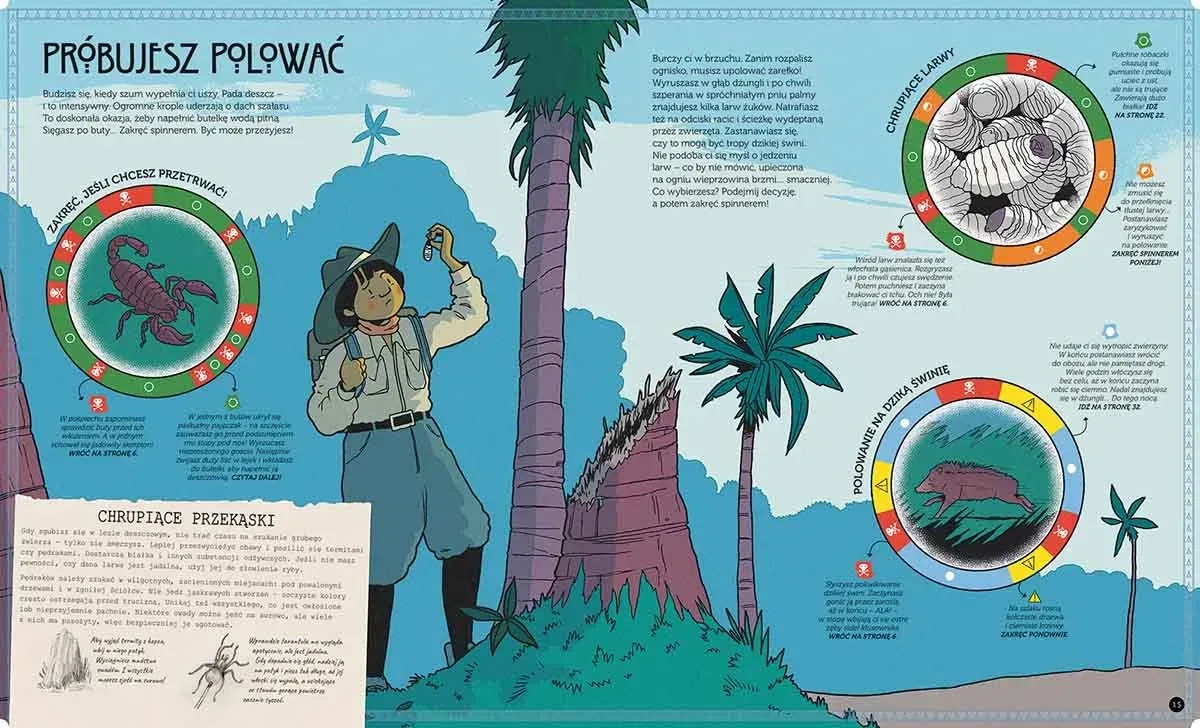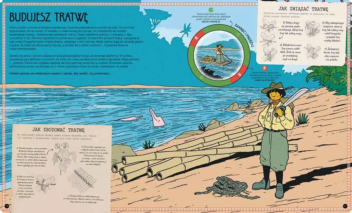 W podejmowaniu kluczowych decyzji pomaga mu, dołączony do książki, specjalny spinner przetrwania. Wystarczy umieści go w wyznaczonych miejscu, zakręcić i kierować się wskazówkami, aby kontynuować wyprawę. Ale jeden zły krok… i zabawa zaczyna się od początku!