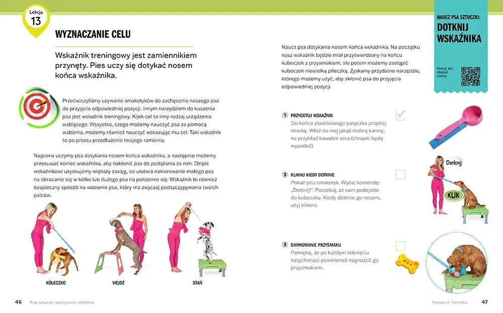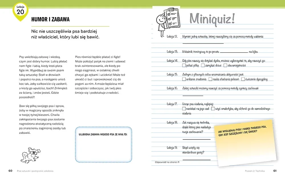 "Psie sztuczki. Podręcznik szkolenia" to kompleksowy przewodnik, który wprowadza czytelnika w podstawowe koncepcje tresury psów, umożliwiając nauczenie pupila 32 różnorodnych komend i sztuczek. Książka jest podzielona na cztery poziomy zaawansowania, co pozwala na stopniowe opanowywanie kluczowych elementów szkolenia, takich jak timing, technika, motywacja oraz samokontrola. Dzięki temu budujesz silniejszą więź ze swoim czworonogiem. W podręczniku znajdziesz: - Instrukcje krok po kroku, zilustrowane zdjęciami, ułatwiające naukę 32 sztuczek. - Dostęp do odpowiednich samouczków wideo poprzez kody QR. - Oceny i miniquizy, które pomogą monitorować postępy. - Krótkie wskazówki oraz dodatkowe informacje uzupełniające. - Schematy sesji treningowych, ułatwiające planowanie nauki.Dlaczego warto kupić