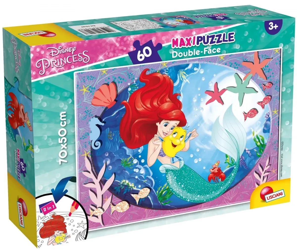 Wyjątkowe puzzle dwustronne składające się z 60 elementów. Po ułożeniu tworzą obrazek o wymiarach 70 x 50 cm. Dwustronne puzzle zapewniają dwa razy więcej zabawy! Po ułożeniu obrazka dziecko może pokolorować identyczną ilustrację na drugiej stronie puzzli.