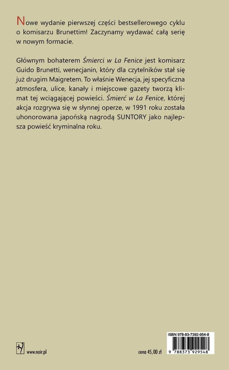 Głównym bohaterem "Śmierci w La Fenice" jest komisarz Guido Brunetti, wenecjanin, który dla czytelników stał się już drugim Maigretem. To właśnie Wenecja, jest specyficzna atmosfera, ulice, kanały i miejscowe gazety tworzą klimat tej wciągającej powieści. "Śmierć w La Fenice", której akcja rozgrywa się w słynnej operze, w 1991 roku została uhonorowana japońską nagrodę SUNTORY jako najlepsza powieść kryminalna roku.