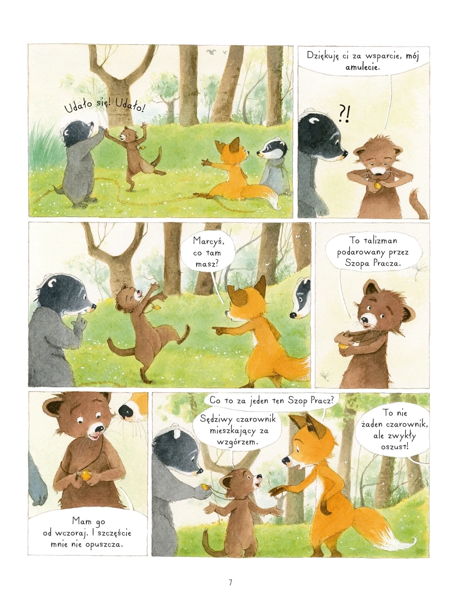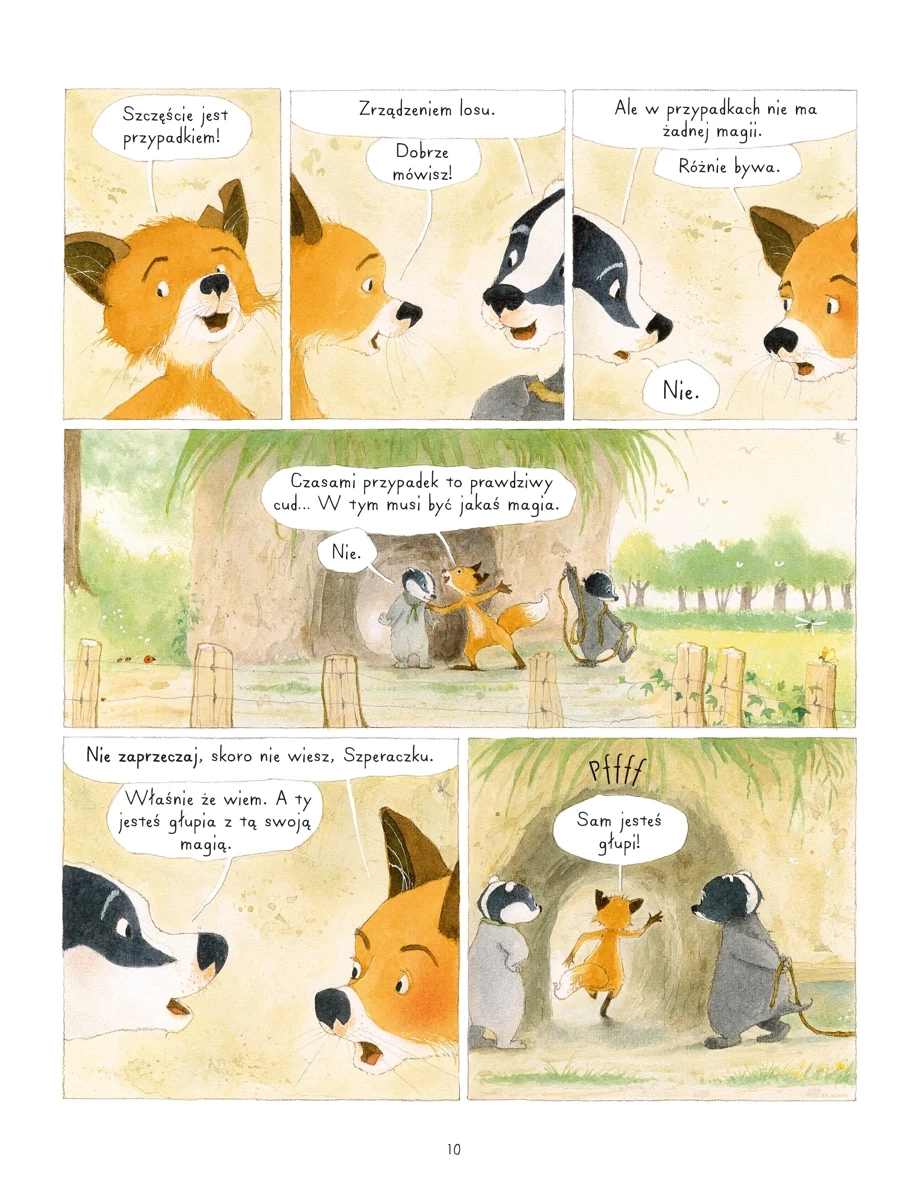 Wszyscy zapragnęli mieć talizman przynoszący szczęście. Jedynie Szperaczek nie wierzy w czarodziejskie moce amuletów. Czy dobre i złe przygody, które nas spotykają, to dzieło czystego przypadku lub magii? Czy przedmioty mogą zapewnić nam szczęście? A może trzeba go szukać gdzie indziej? Ludzkie charaktery w zwierzęcych maskach, zabawne perypetie i próba zmierzenia się z innością, która zamiast dzielić, łączy naszych sympatycznych bohaterów. Według dziennika „Le Monde” historia pana Borsuka i pani Lisicy to „przepełniona humorem i czułością piękna lekcja tolerancji”.