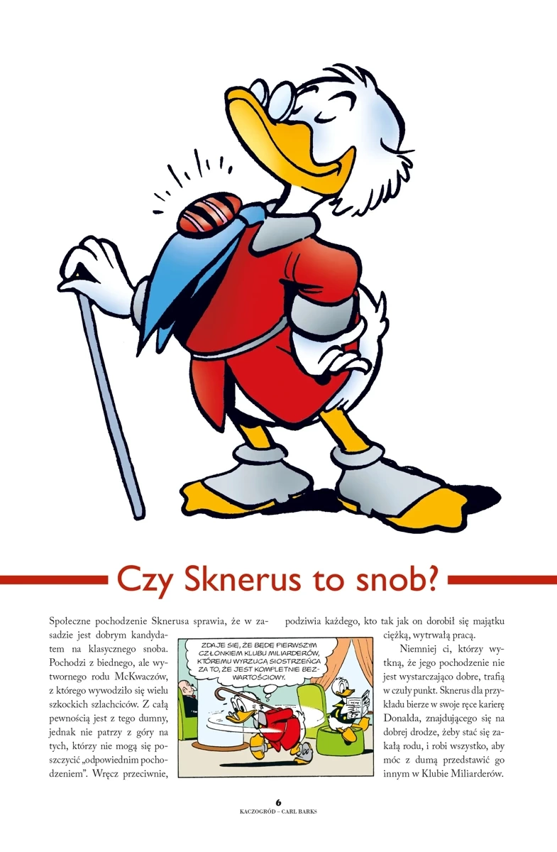 Niniejszy album zawiera komiksy Carla Barksa z lat 1962–1963. W tytułowej „Walce o status” Sknerus chce wejść w posiadanie przedmiotu, który podniesie jego pozycję społeczną i sprawi, że kaczogrodzka śmietanka towarzyska zacznie go zapraszać na swoje przyjęcia. Tym przedmiotem jest pasiasty rubin. Ten niezwykły kamień później pojawiał się wielokrotnie w innych komiksach (m.in. Dona Rosy) czy w serialu „Kacze opowieści”. Miliarder musi stawić czoło swoim dawnym wrogom, Braciom Be. Banda daje mu się we znaki także w komiksie „Twarde jak szkło”. W tej samej historii powraca również Magika de Czar, która zadebiutowała w poprzednim tomie. Czarownica odgrywa główną rolę w trzecim z czterech dłuższych komiksów w zbiorze – „Odysei miliardera”. Czwarty, „Przyprawa z wyprawy”, opowiada o podróży Sknerusa, Donalda i siostrzeńców do Ameryki Południowej. Nie brak tu oczywiście także charakterystycznych dla Barksa dziesięciostronicowych historii o Donaldzie. Występuje on w rozmaitych rolach, między innymi: kierowcy wyścigowego, operatora promu, fotografa przyrody, eksperta od rozbiórek, flisaka, zarządcy motelu i strażnika leśnego, a raz ma nawet do czynienia ze wspomnianą już Magiką. „Kaczogród” to kolekcja uwielbianych klasycznych komiksów, napisanych i narysowanych przez Carla Barksa w latach 1943–1972. Komiksy są prezentowane w kolejności chronologicznej. To prawdziwy skarb dla fanów!
